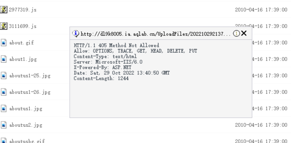 发现虽然能连接,但是有报405错误,这里是因为上传的一句话被当作图片执行,并没有正确执行,查看信息我们可得这里的中间件是iis6。