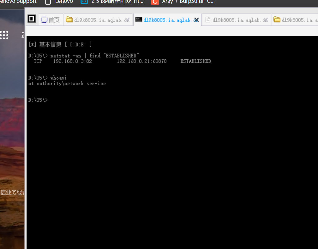 因为在d盘有权限,所以我在d盘上传了个cmd.exe来调用命令