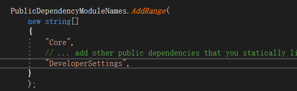 1 //先准备好命名 2 const FName UDisplayClusterEditorSettings::Container = TEXT("Project"); 3 const FName UDisplayClusterEditorSettings::Category = TEXT("Plugins"); 4 const FName UDisplayClusterEditorSettings::Section = TEXT("nDisplay"); 5 6 //在StartupModule()函数中调用RegisterSettings()函数 7 void FDisplayClusterEditorModule::RegisterSettings() 8 { 9 //通过FModuleManager获取到ISettingsModule接口,并调用接口函数进行注册 10 if (ISettingsModule* SettingsModule = FModuleManager::GetModulePtr<ISettingsModule>("Settings")) 11 { 12 SettingsModule->RegisterSettings( 13 UDisplayClusterEditorSettings::Container, 14 UDisplayClusterEditorSettings::Category, 15 UDisplayClusterEditorSettings::Section, 16 LOCTEXT("RuntimeSettingsName", "nDisplay"), 17 LOCTEXT("RuntimeSettingsDescription", "Configure nDisplay"), 18 GetMutableDefault<UDisplayClusterEditorSettings>() 19 ); 20 } 21 }