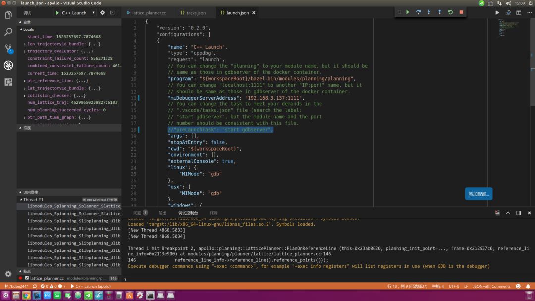 在调试电脑上使用VSCode打开Apollo项目,注意项目版本应与工控机上的版本一致,否则调试起来会输出许多不一致的信息。首先,将配置文件.vscode/launch.json中的调试前加载任务行:"preLaunchTask": "start gdbserver",注释掉,再将远程调试服务地址修改为:"miDebuggerServerAddress": "192.168.3.137:1111",,如下图所示: