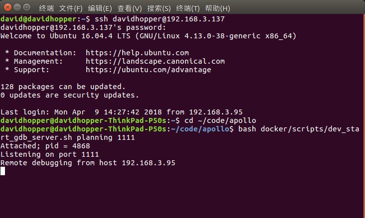 研发过程中,我们还需远程调试车内工控机上的Apollo项目,即在调试电脑上借助SSH服务连接车内工控机,启动工控机内相关进程,然后在调试电脑上进行远程调试。下面以调试planning模块为例进行具体阐述: