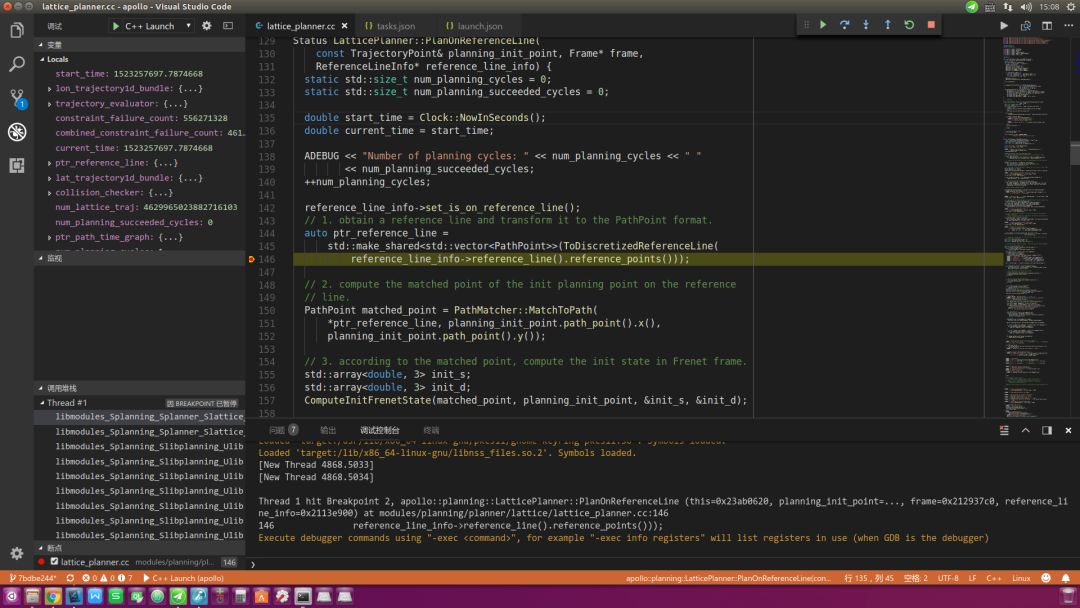 在宿主机上使用VSCode打开Apollo项目(必须是你刚才构建的版本),打开需要调试的文件,在指定位置设置断点,按“F5”键启动调试。注意:由于VSCode使用脚本语言编写,因此启动过程会较慢,若加上网速不够快,甚至出现一分钟等待也有可能。调试方法和Visual Studio类似,此处不再赘述。如下图所示: