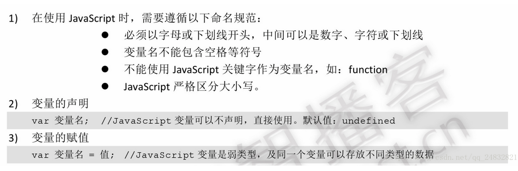 变量可以不用声明,变量是弱类型。 统一使用 var 来定义! 定义变量的时候不要使用关键字和保留字。