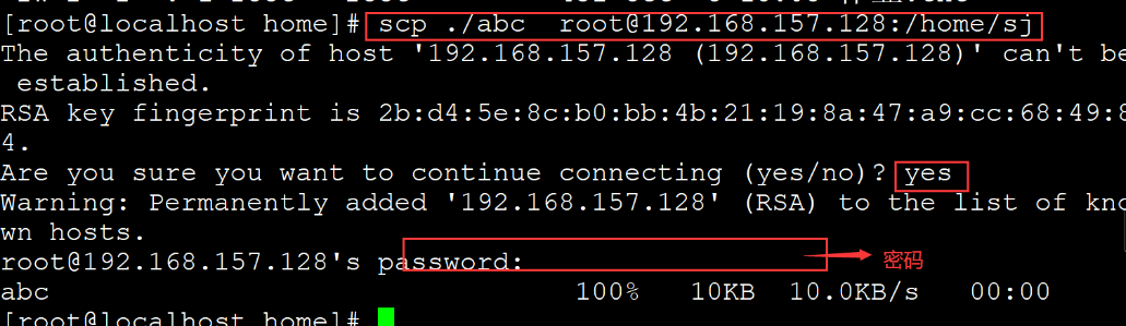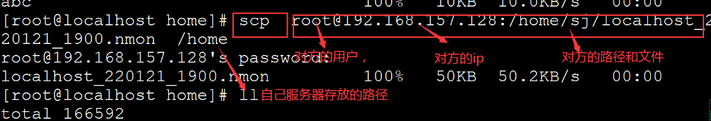 scp +本地文件名称 用户@服务器2ip地址:/保存的路径