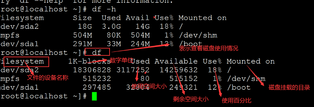 1K-blocks:说明下面的数字单位是1KB,可利用-h或-m来改变单位大小,也可以用-B来设置。