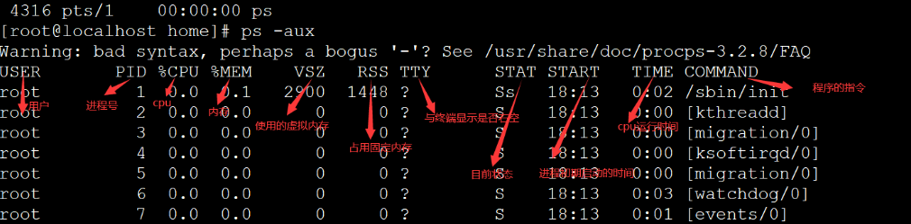 TTY :该进程是在那个终端机上面运作,若与终端机无关,则显示 ?。另外, tty1-tty6 是本机上面的登入者程序,若为 pts/0 等等的,则表示为由网络连接进主机的程序。
