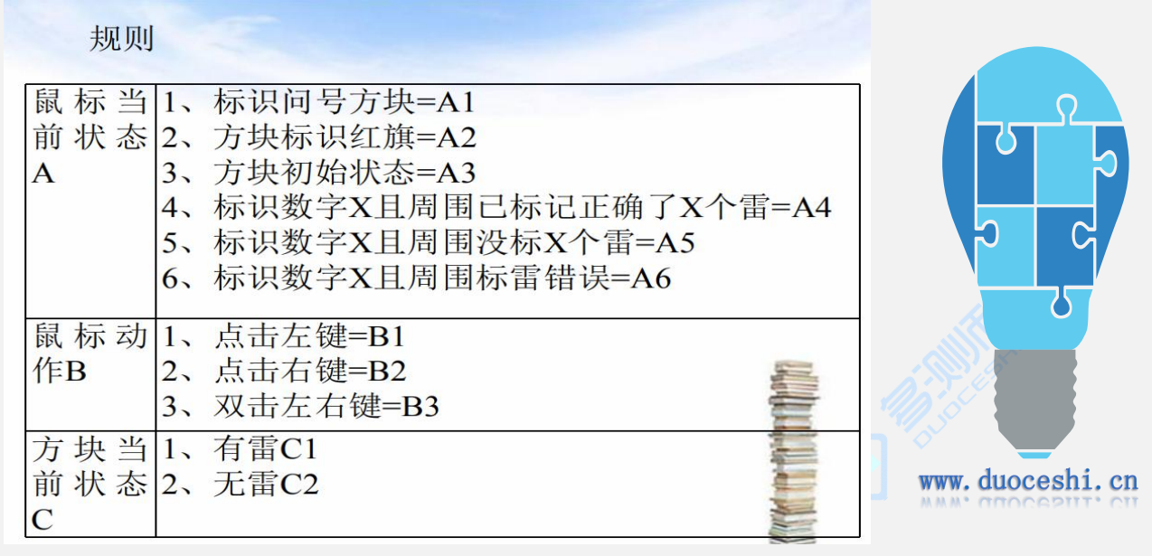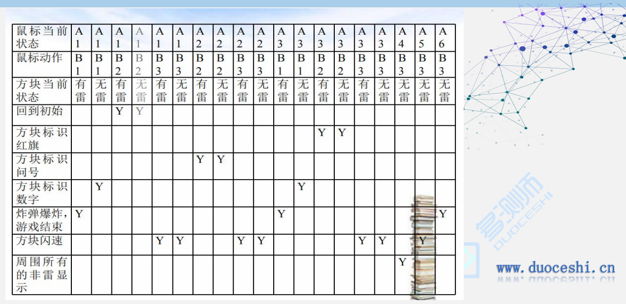 - 根据因果图确定各个条件组合对应的动作, 并且确定判定表中各个规则的条件项和动 作项,