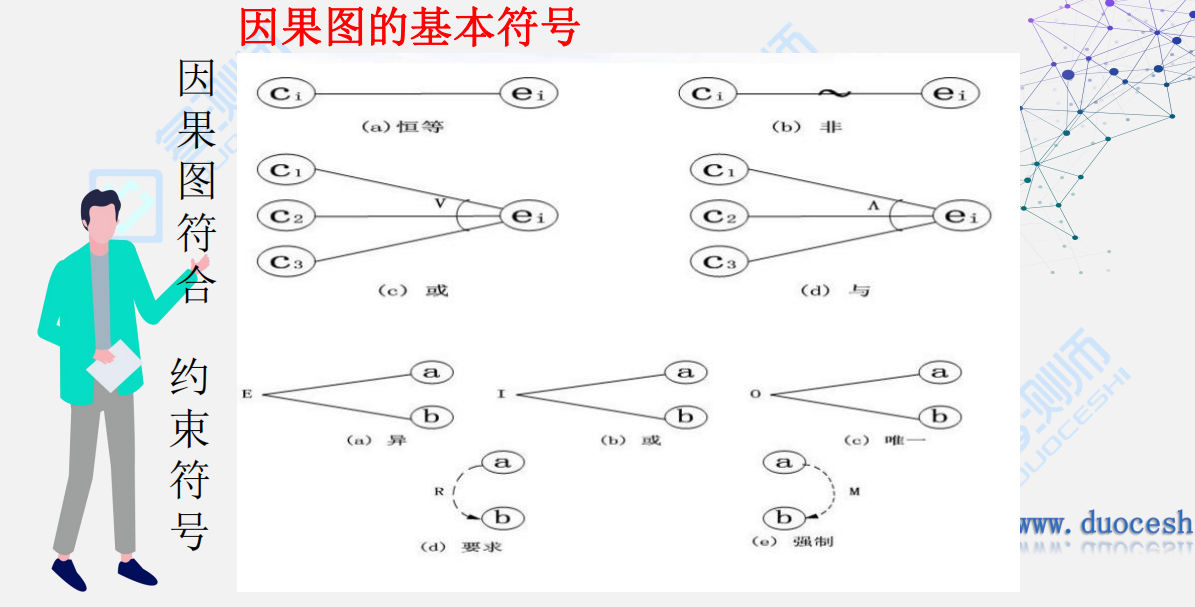 - 因果图法能够帮助我们按照一定步骤,高效的选择 测试用例,设计多个输入条件组合用例