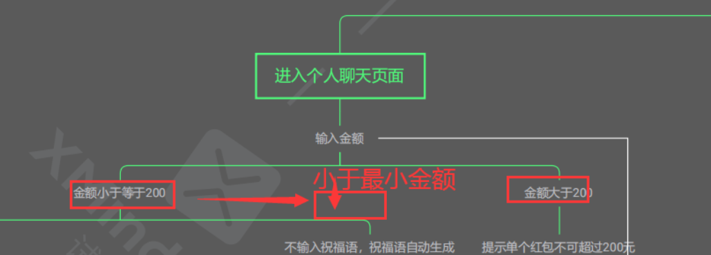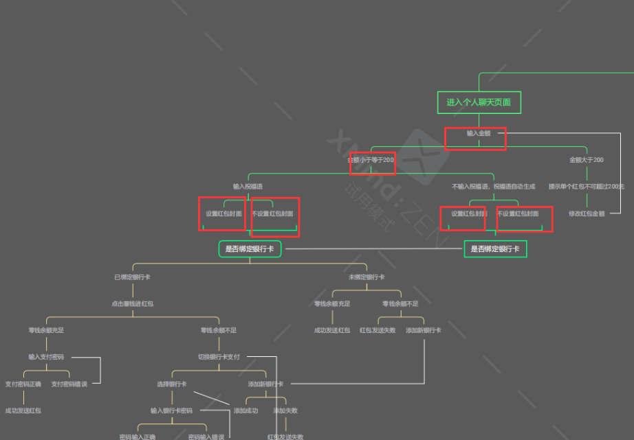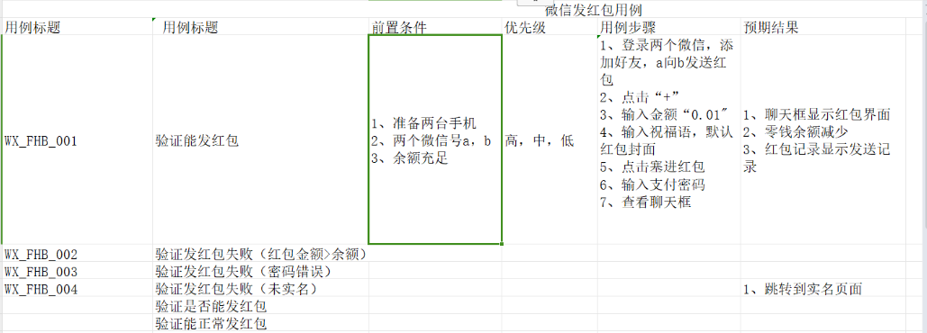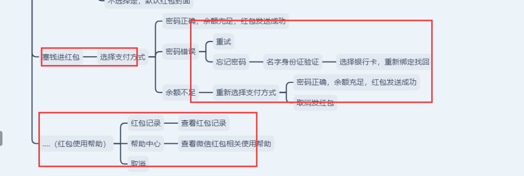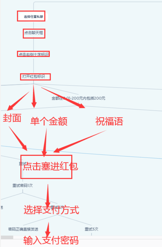 2、按照主流离来进行编写用例(功能:+,金额,个数,封面,祝福语,塞进红包,选择支付方式,查看红包,红包记录,红包扣款,)