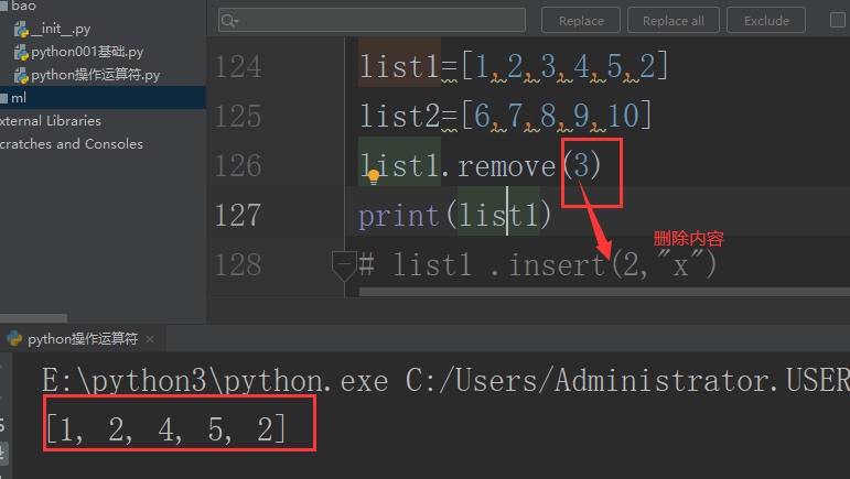 5、remove 删除表中值(删除的是输入的数据,只删一个数据,如果数据重复,就删索引位靠前的)