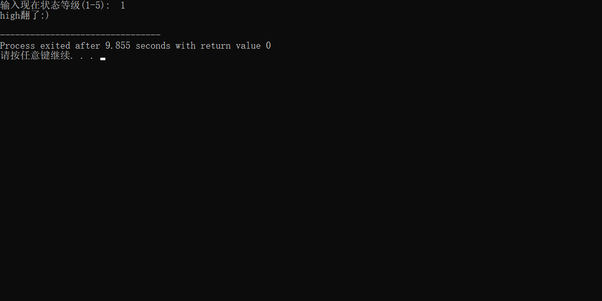 #include <stdio.h> int main() { int level; printf("输入现在状态等级(1-5): "); scanf("%d",&level); switch(level) { case 1: printf("high翻了:)\n"); break; case 2: printf("low爆了:(\n"); break; default: printf("一言难尽,无法概括。。。\n"); } return 0; }