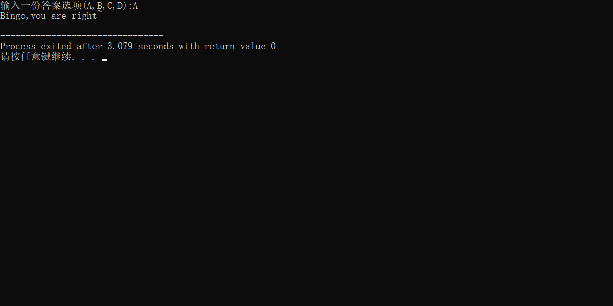 #include<stdio.h> #include<stdlib.h> int main() { int option,A,B,C,D; A=='A'; B=='B'; C=='C'; D=='D'; printf("输入一份答案选项(A,B,C,D):"); scanf("%c",&option); if(option!='A'&&option!='B'&&option!='C'&&option!='D') { printf("数据输入错误!\n"); exit(0); } if(option=='A') printf("Bingo,you are right~\n"); else if(option=='B'||option=='C'||option=='D') printf("try again~\n"); return 0; }