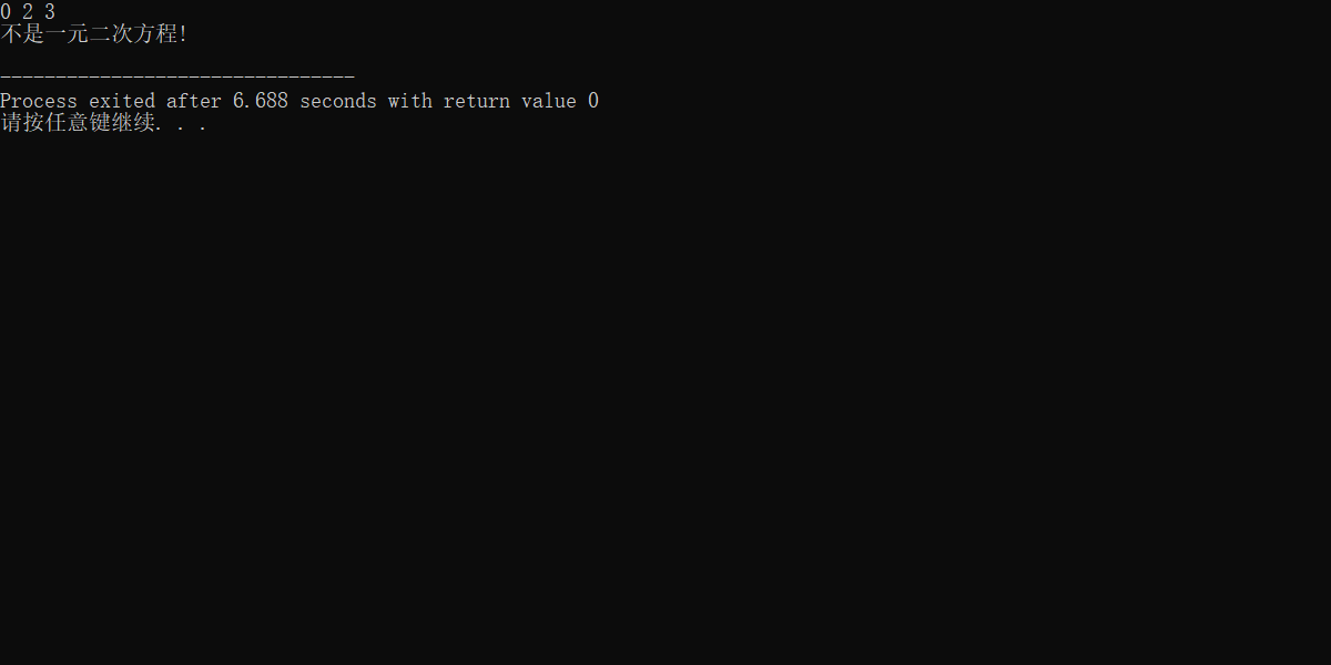 #include<stdio.h> #include<math.h> int main() { double a,b,c,delta,x1,x2,p,q; scanf("%lf%lf%lf",&a,&b,&c); if(a==0) printf("不是一元二次方程!\n"); else { delta=b*b-4*a*c; if(delta==0) { printf("方程有两个相同的实数根!\n"); x1=-b/(2*a); x2=x1; printf("%.2lf , %.2lf\n",x1,x2); } else if(delta>0) { printf("方程有两个不相等的实数根!\n"); x1=-b/(2*a)+sqrt(delta)/(2*a); x2=-b/(2*a)-sqrt(delta)/(2*a); printf("%.2lf , %.2lf\n",x1,x2); } else { printf("方程有两个不相等的复数根!\n"); p=-b/(2*a); q=sqrt(-delta)/(2*a); printf("%.2lf+%.2lfi\n",p,q); printf("%.2lf-%.2lfi\n",p,q); } } return 0; }