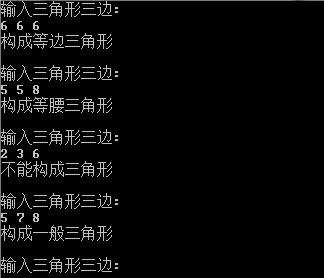 #include <stdio.h> int main() { double a,b,c; printf("输入三角形三边:\n"); while(scanf("%lf%lf%lf",&a,&b,&c)) { if(a+b>c && a+c>b && b+c>a) { if(a==b && a==c) printf("构成等边三角形\n"); else if(a==b || a==c || b==c) printf("构成等腰三角形\n"); else printf("构成一般三角形\n"); } else printf("不能构成三角形\n"); printf("\n输入三角形三边:\n"); } return 0; }