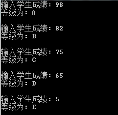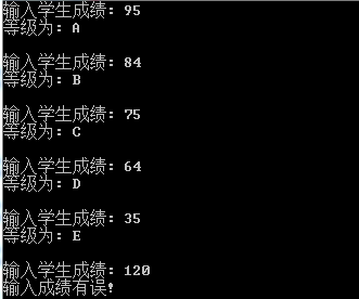 #include <stdio.h> int main() { int score; char grade; while(1) { printf("输入学生成绩: "); if(scanf("%d",&score) == 0) break; if(score<0 || score > 100) { printf("输入成绩有误!\n\n"); continue; } switch(score/10) { case 10: case 9: grade='A'; break; case 8: grade='B'; break; case 7: grade='C'; break; case 6: grade='D'; break; default: grade='E'; } printf("等级为: %c\n\n", grade); } return 0; }
