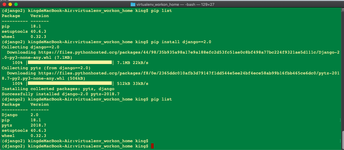 django2) kingdeMacBook-Air:virtualenv_workon_home king$ pip list Package Version ---------- ------- pip 18.1 setuptools 40.6.3 wheel 0.32.3 (django2) kingdeMacBook-Air:virtualenv_workon_home king$ pip install django==2.0 Collecting django==2.0 Downloading https://files.pythonhosted.org/packages/44/98/35b935a98a17e9a188efc2d53fc51ae0c8bf498a77bc224f9321ae5d111c/Django-2.0-py3-none-any.whl (7.1MB) 100% |████████████████████████████████| 7.1MB 22kB/s Collecting pytz (from django==2.0) Downloading https://files.pythonhosted.org/packages/f8/0e/2365ddc010afb3d79147f1dd544e5ee24bf4ece58ab99b16fbb465ce6dc0/pytz-2018.7-py2.py3-none-any.whl (506kB) 100% |████████████████████████████████| 512kB 33kB/s Installing collected packages: pytz, django Successfully installed django-2.0 pytz-2018.7 (django2) kingdeMacBook-Air:virtualenv_workon_home king$ pip list Package Version ---------- ------- Django 2.0 pip 18.1 pytz 2018.7 setuptools 40.6.3 wheel 0.32.3 (django2) kingdeMacBook-Air:virtualenv_workon_home king$