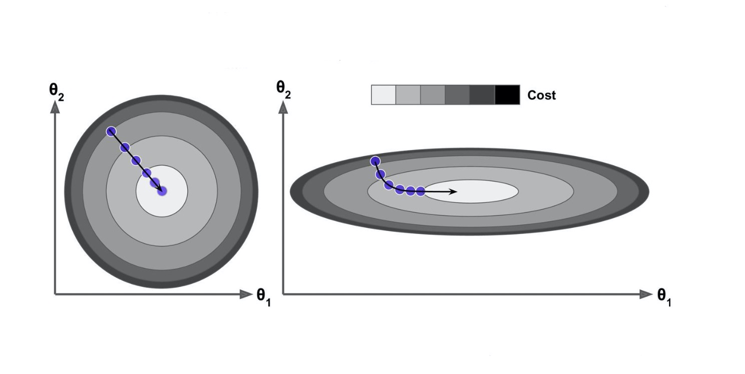 因为 \(x_1 \ll x_2\),根据梯度公式 \(g_j= (h_{\theta}(x) - y)x_j\) ,得出 \(g_1 \ll g_2\)。根据梯度下降公式:\(\theta_j^{n+1} = \theta_j^n - \eta * g_j\) 可知,每次调整 \(\theta_1\) 的幅度 \(\ll\) (远小于) \(\theta_2\) 的调整幅度。