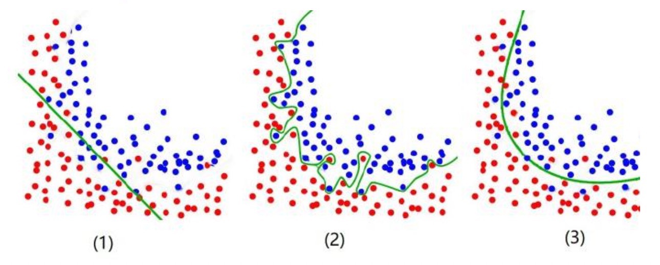 - 恰到好处(just right):过拟合前,训练集和测试集准确率都达到巅峰。好比,学习并不需要花费很多时间,理解的很好,考试的时候可以很好的把知识举一反三。
