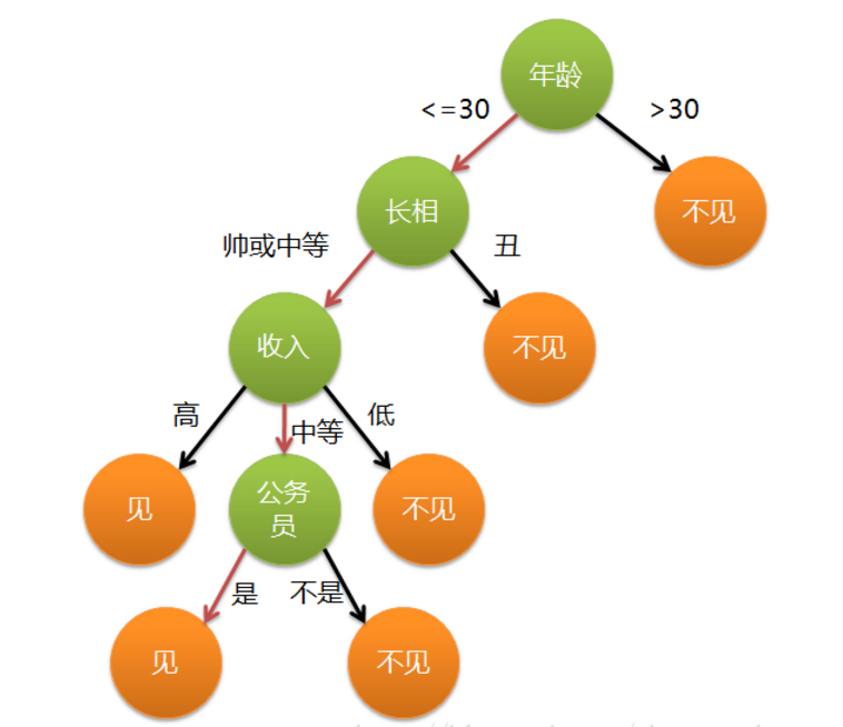 - 上面那棵树中,属性:绿色的节点(年龄、长相、收入、是否是公务员)
