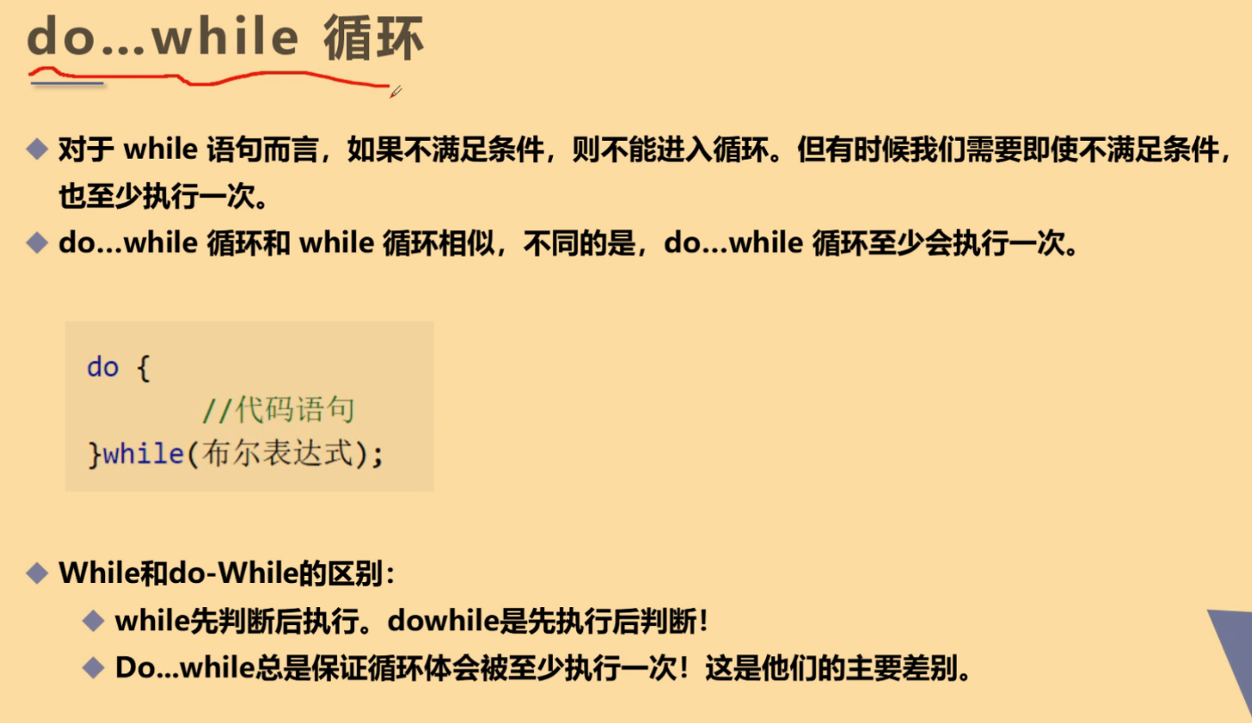 - do while循环语句是先执行、后判断。不管条件是否满足,至少会执行一次