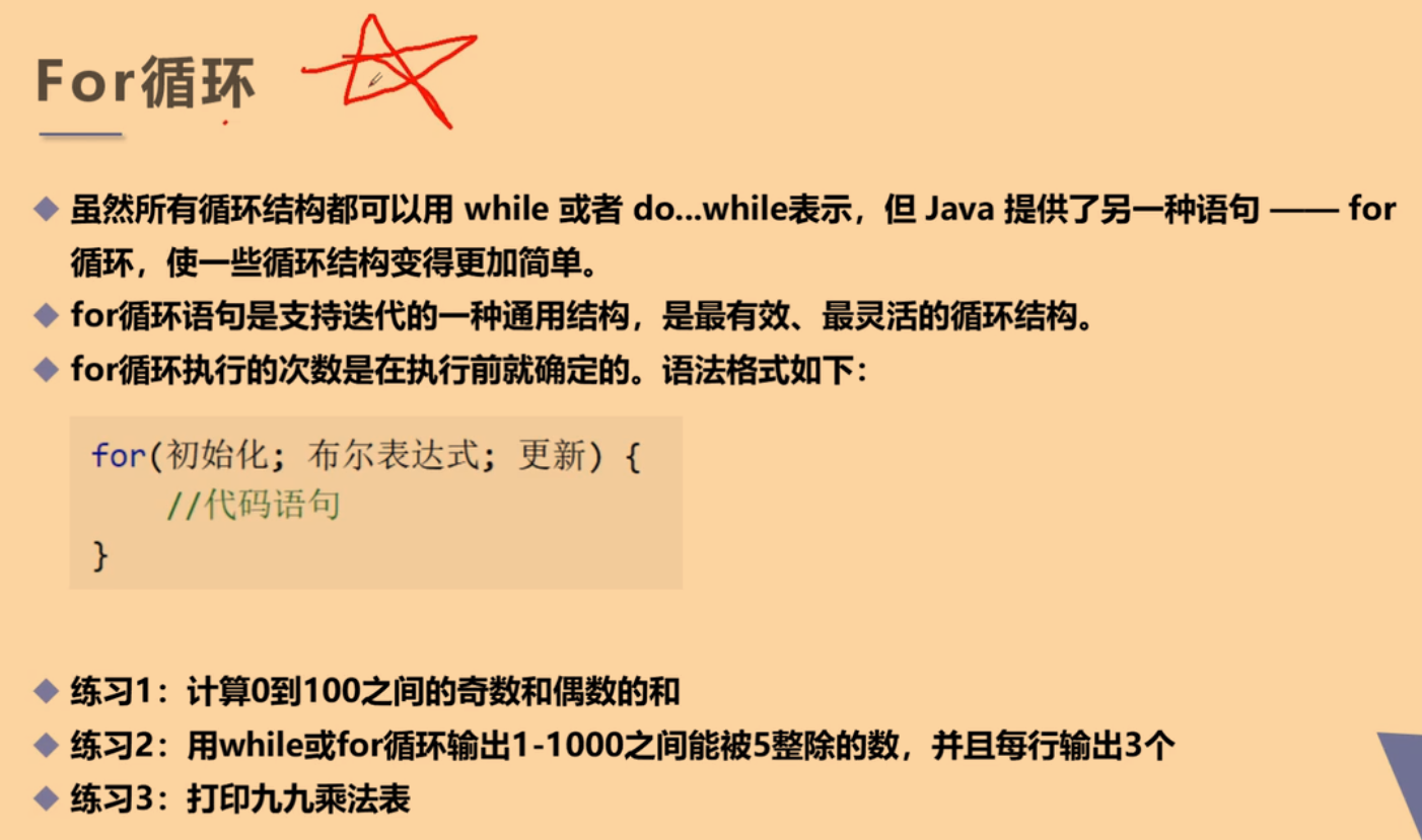 - 虽然所有循环结构都可以用while或者do…while表示,但Java提供了另一种语句——for循环,使一些循环结构变得更加简单。