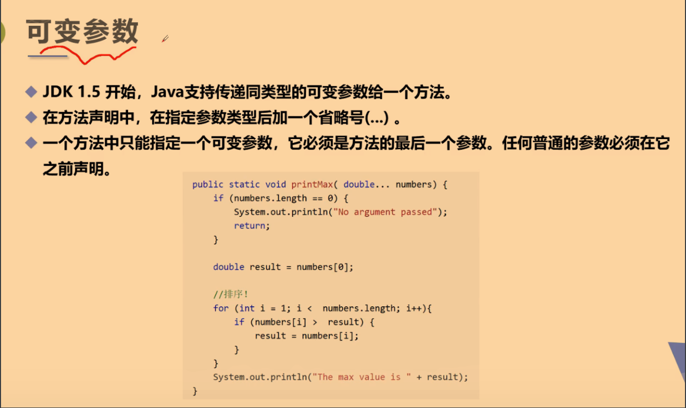 - 一个方法中只能指定一个可变参数,它必须时方法的最后一个参数。任何普通的参数必须在它之间声明。