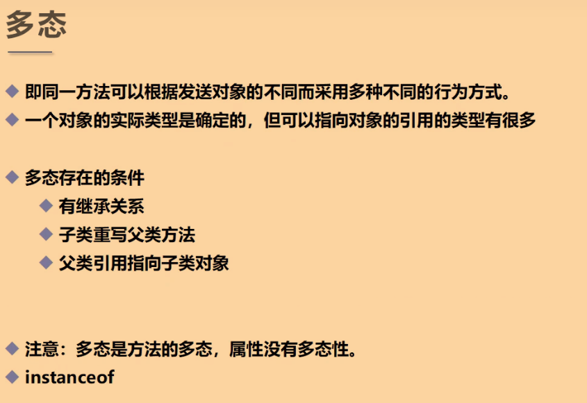 - 一个对象的实际类型是确定的,但可以指向对象的引用的类型有很多 (父类,有关系的类)