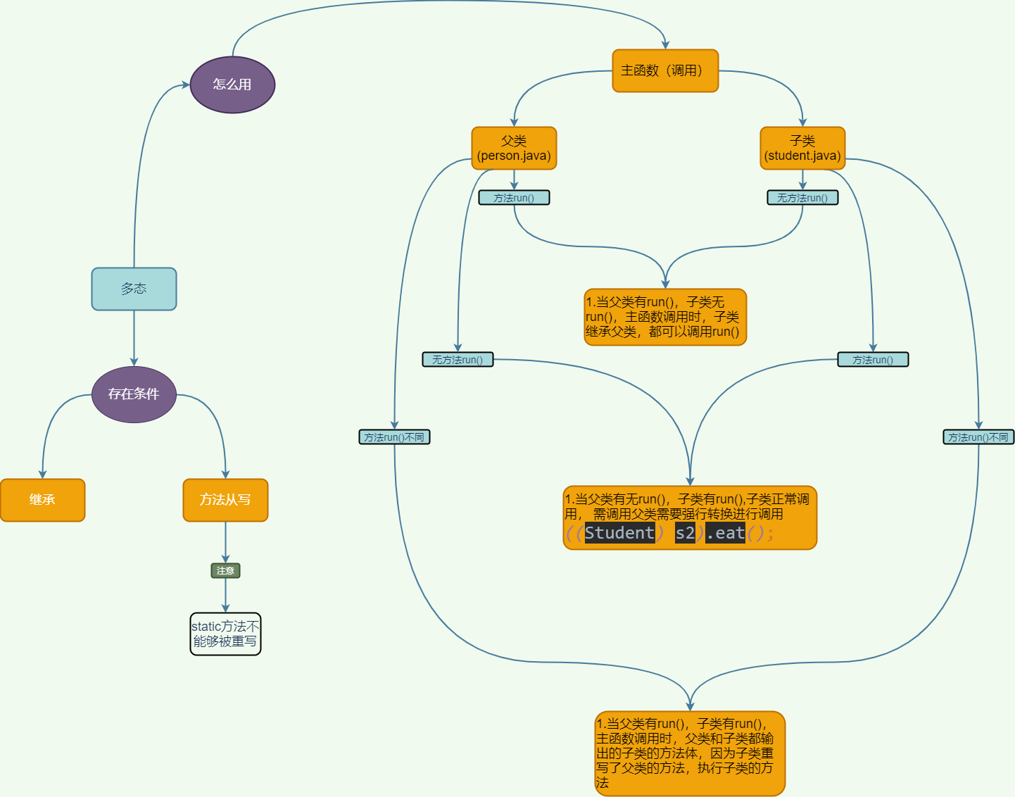 3.存在的条件:继承关系,方法需要重写,父类引用指向了子类对象!Father f1 = New Son();
