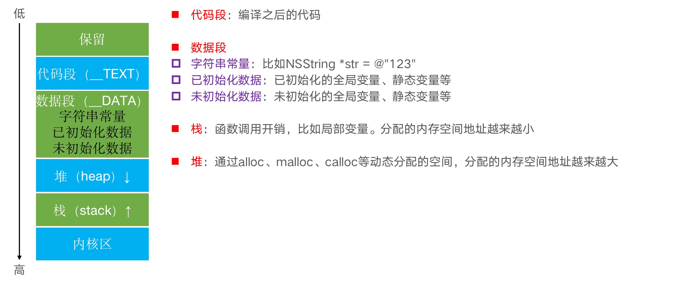 注意: 字符串常量严格来说应该是存储在__TEXT段,只是我们习惯把他归于数据段