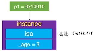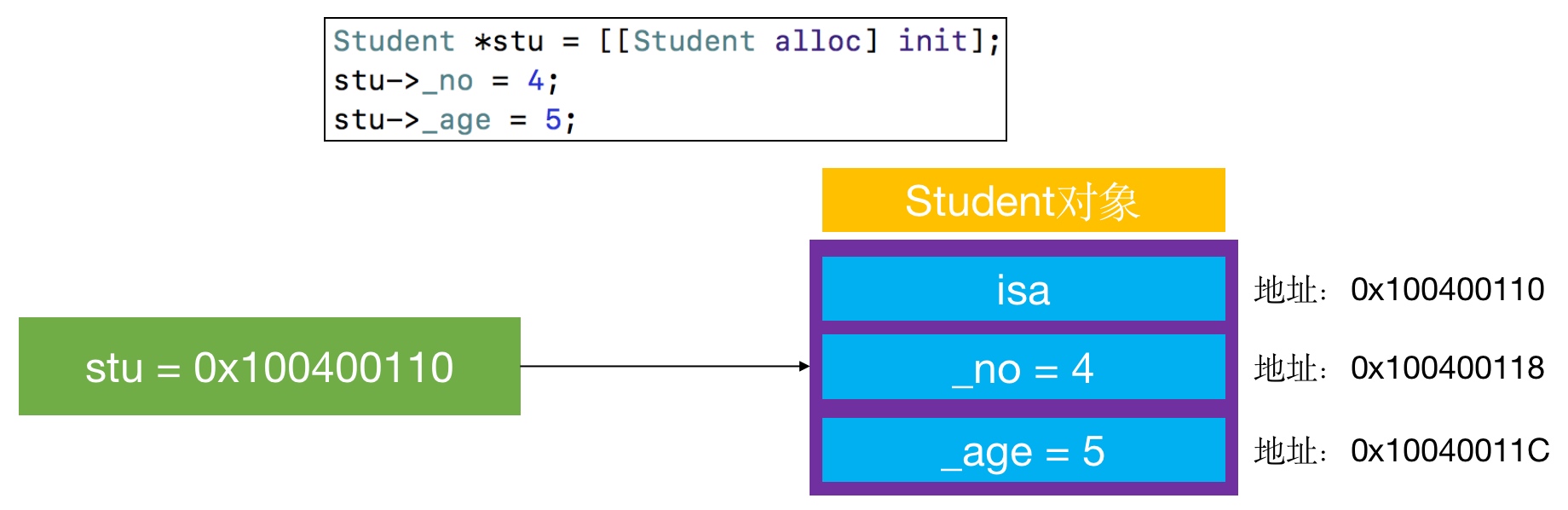 一个OC对象在内存中的布局是这样的,系统会在堆中开辟一块内存空间存放该对象,这块空间里还包含成员变量和isa指针。然后栈里的局部变量指向这块存储空间的地址