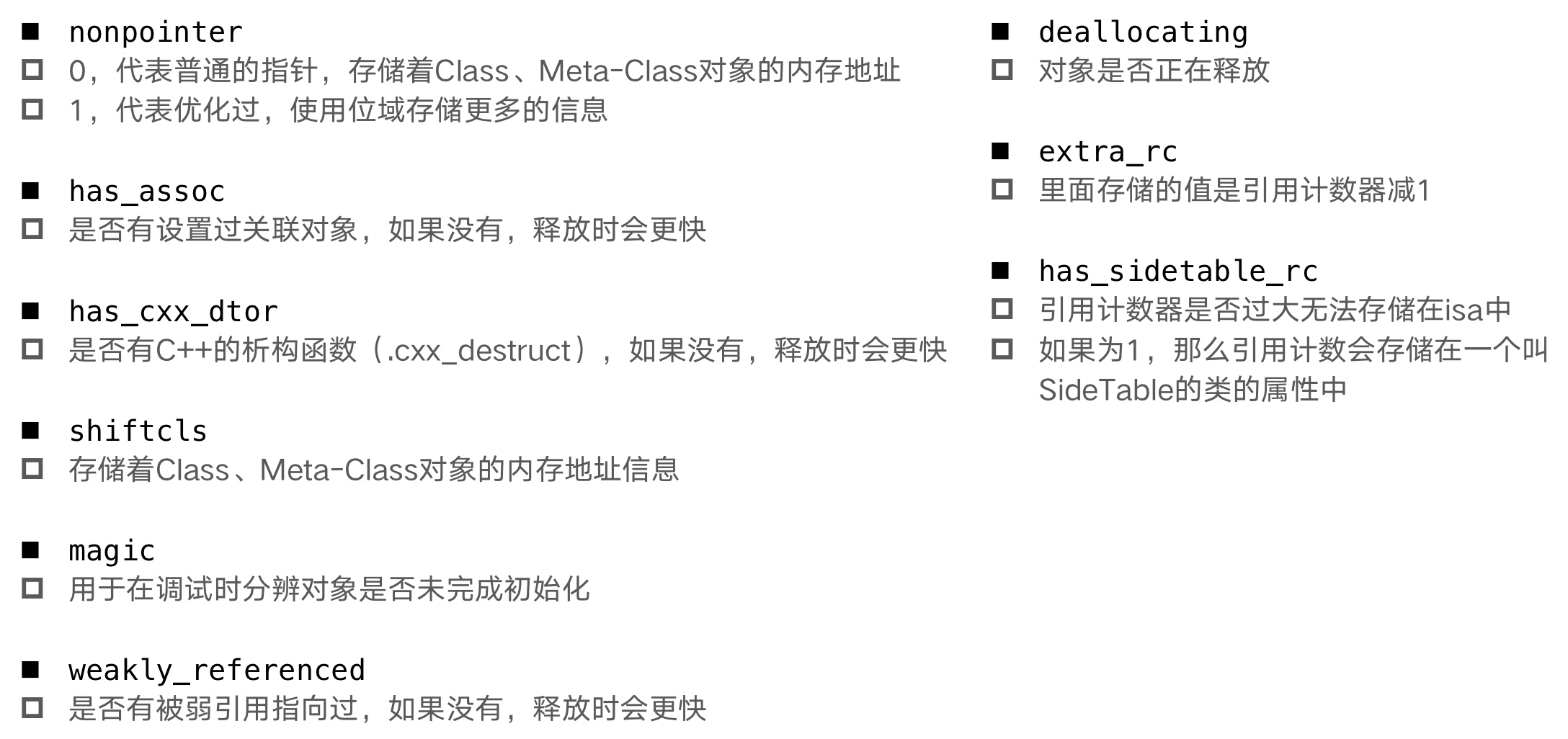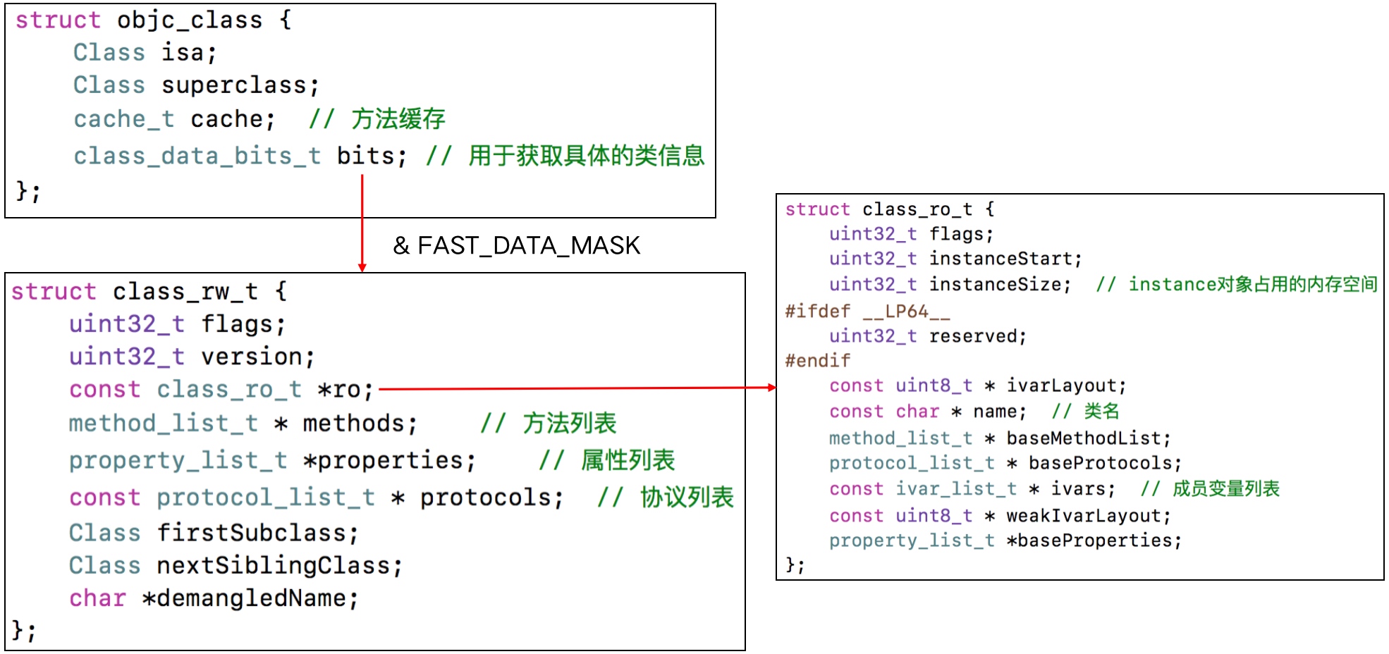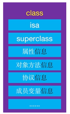 - isa指针- superclass指针- 类的属性信息(@property)、类的对象方法信息(instance method)- 类的协议信息(protocol)、类的成员变量信息(ivar)