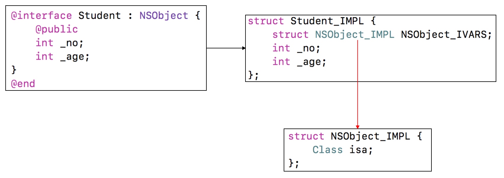 凡是继承自NSObject的对象,都会自带一个类型是Class的isa的成员变量,将其转成C++,就可以看到NSObject本质上是一个叫做NSObject_IMPL的结构体,其成员变量isa本质上也是一个指向objc_class结构体的指针