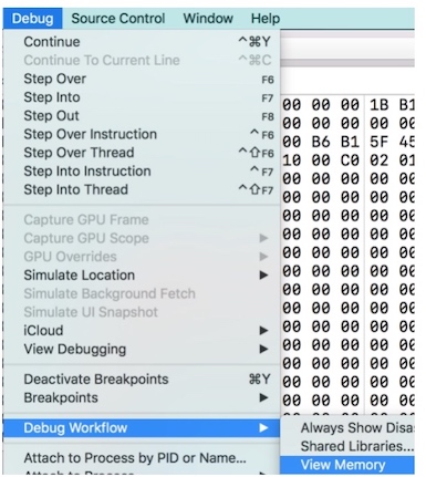 运行Xcode,选择Debug->Debug Workflow -> View Memory查看内存数据
