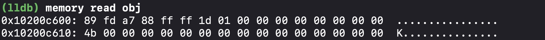 利用LLDB的memory read读取对象的内存地址,可以看到也是分配的16个字节