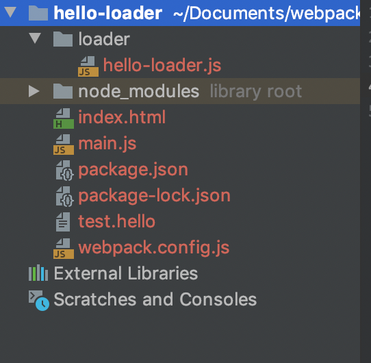 本地安装node环境 mkdir hello-loader && cd hello-loader(创建一个目录,并进来,这就是我们hello-loader的目录了) npm init -y (目的是为了在当前目录初始化,生成一个标准的package.json文件,至于为什么带有-y,大家可以自行搜索哈),截止到目前,当前目录只有一个pakcage.json文件 npm i -D webpack webpack-cli (如果install失败,可能是webpack需要全局安装,改成-g) ,此时当前目录下有node_modules、package.json、package-lock.json,三个文件 依次创建 loader目录,loader/hello-loader.js , main.js, index.html, webpack.config.js (以上所有文件都是空的) 创建一个text.hello 的文件(为什么要建这个奇怪的文件呢,是因为为了体现loader来加载webpack不能识别的文件,你要喜欢爱啥啥,这里我就建了一个.hello格式的文件)