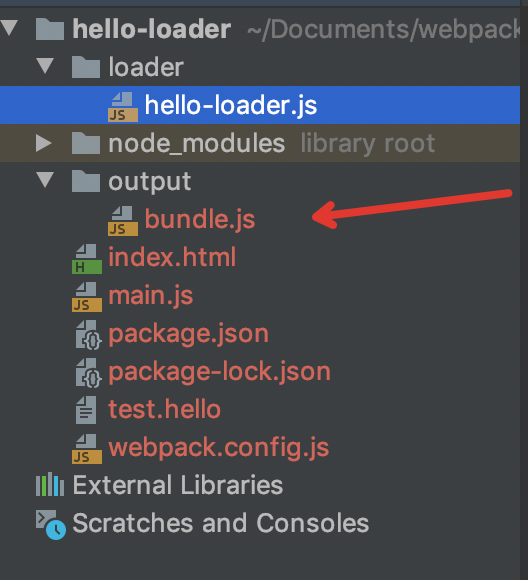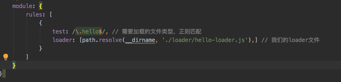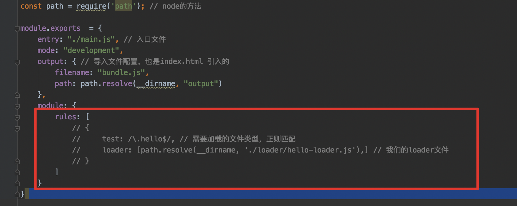 const path = require('path'); // node的方法 module.exports = { entry: "./main.js", // 入口文件 mode: "development", output: { // 导入文件配置,也是index.html 引入的 filename: "bundle.js", path: path.resolve(__dirname, "output") }, module: { rules: [ { test: /\.hello$/, // 需要加载的文件类型,正则匹配 loader: [path.resolve(__dirname, './loader/hello-loader.js'),] // 我们的loader文件 } ] } }