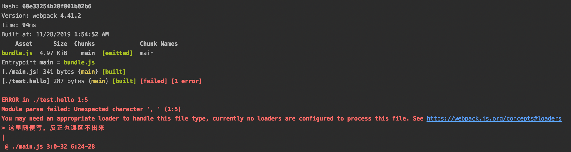我们来验证是不是如果没有我们的loader,webpack是不是就不能正常加载这个文件,口说无评,注释完,保存,再次执行 webpack,报错如下: