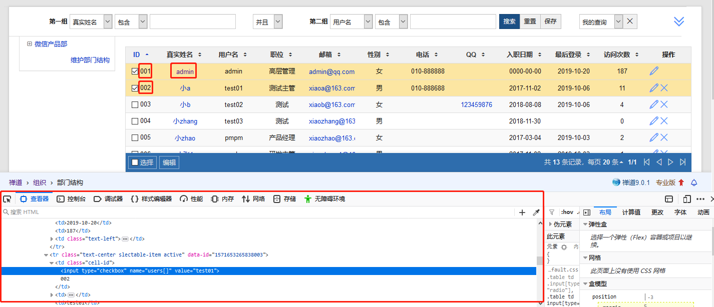 1、 首先找出员工列表中“001”、“admin”、“002”的xpath