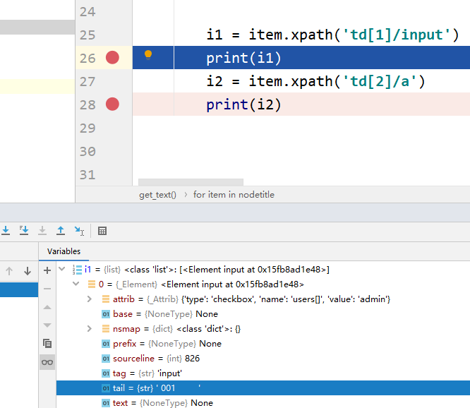 3、取出第一列元素的相对路径,作为item.xpath的参数,就取出第一列元素。将i1打印出来,发现并不是我们需要的值,可以设置断点调试,看到i1[0]的tail属性(i1[0].tail)才是我们需要的第一列“ID”的值。
