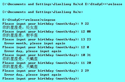 实验内容:以下是星座及其日期范围的对应关系,请根据用户输入的生日(月/日),判断其属于哪个星座。