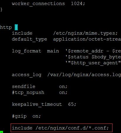 根据include部分可发现改配置内容会包含/etc/nginx/conf.d/*.conf下的文件,进入此目录,发现已经存在default.conf文件,可根据此文件自定义一个新的*.conf配置文件
