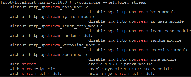 --with-stream enable TCP/UDP proxy module表示不支持,编译时需要手动添加