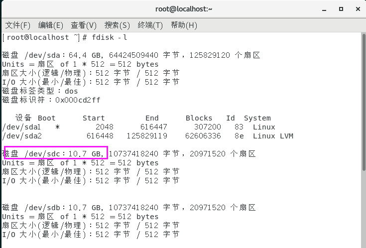 [root@localhost ~]# fdisk /dev/sdc 欢迎使用 fdisk (util-linux 2.23.2)。 更改将停留在内存中,直到您决定将更改写入磁盘。 使用写入命令前请三思。 Device does not contain a recognized partition table 使用磁盘标识符 0xdbcdef98 创建新的 DOS 磁盘标签。 命令(输入 m 获取帮助):n Partition type: p primary (0 primary, 0 extended, 4 free) e extended Select (default p): Using default response p 分区号 (1-4,默认 1): 起始 扇区 (2048-20971519,默认为 2048): 将使用默认值 2048 Last 扇区, +扇区 or +size{K,M,G} (2048-20971519,默认为 20971519): 将使用默认值 20971519 分区 1 已设置为 Linux 类型,大小设为 10 GiB 命令(输入 m 获取帮助):t 已选择分区 1 Hex 代码(输入 L 列出所有代码):8e 已将分区“Linux”的类型更改为“Linux LVM” 命令(输入 m 获取帮助):w The partition table has been altered! Calling ioctl() to re-read partition table. 正在同步磁盘。 [root@localhost ~]# partprobe