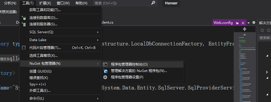 四、完成数据迁移命令-》菜单点-》工具-》NuGet包管理器->程序包管理器控制台