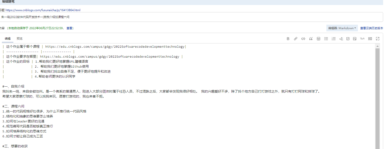 朱一鸣|2022软件代码开发技术作业一|自我介绍加课程六问