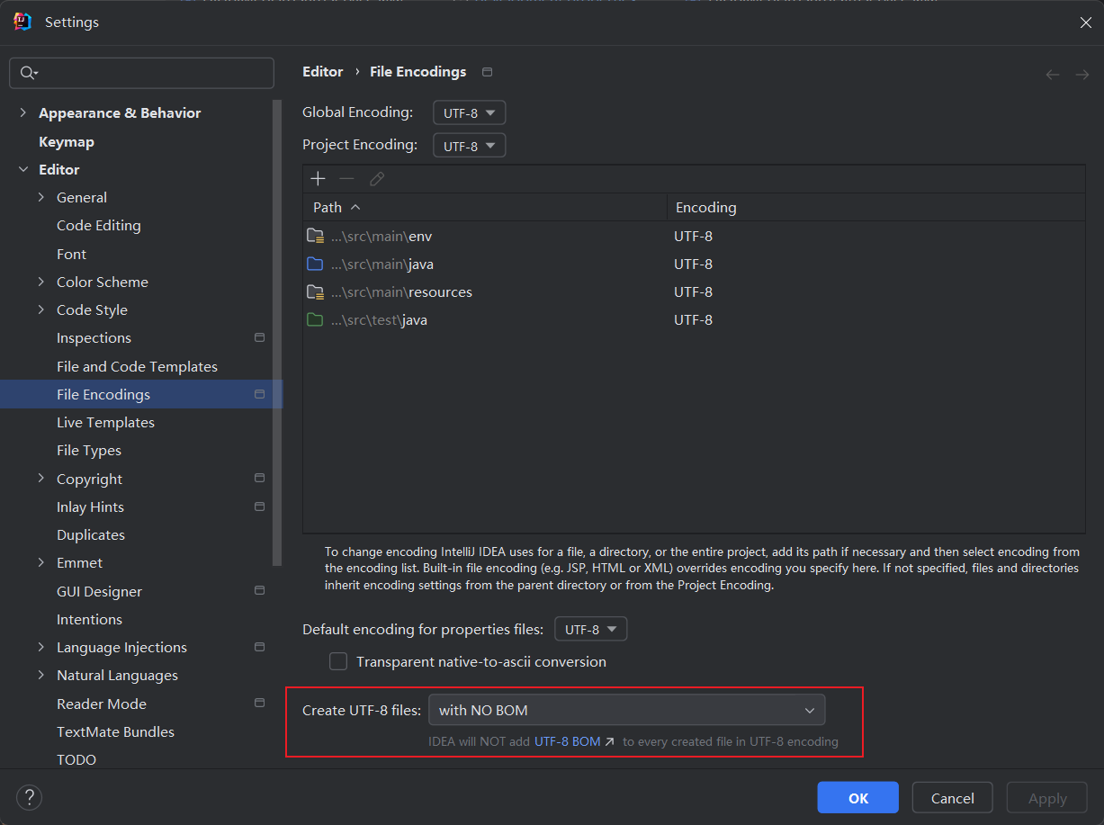 想要不会每次新建项目时候都会出现这种问题,那就在file encodings这里选择with no BOM。然后应用-确定下次新建时候就不会出现这样的问题了。
