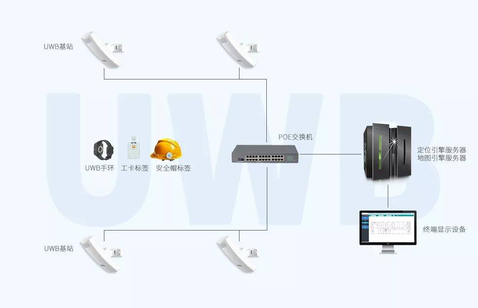 UWB定位系统由UWB基站,UWB标签,UWB定位引擎和终端显示器构成。系统架构如下: