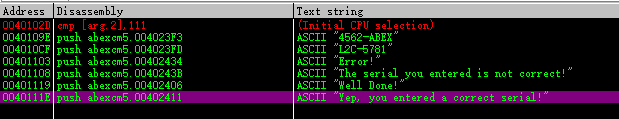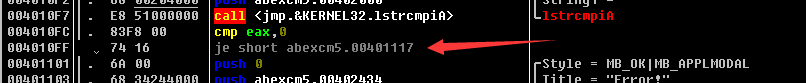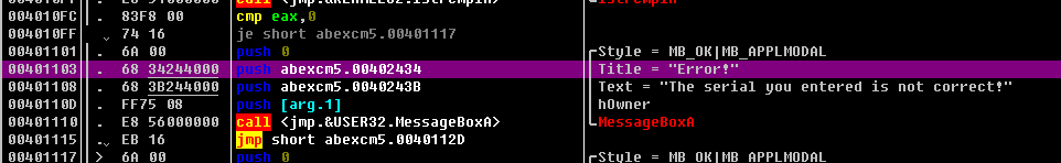 可以看到这里调用了一个MassageBoxA弹窗函数,title是"error",text是"The serial you entered is not correct!",往上找找,就可以看见一个判断跳转指令