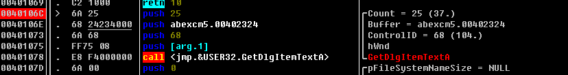 这个函数调用名字叫GetDIgItemTextA,主要用于检索与对话框中的控件关联的标题或文本(人话:就是获得你输入在框里面的字符串)